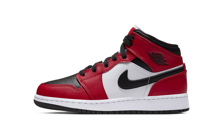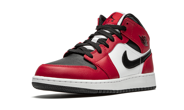 The Air Jordan 1 Mid GS “Chicago Black Toe” is the youth sizing of the model that combines two popular looks of Michael Jordan’s first signature shoe. Recruiting both the famous “Chicago” and “Black Toe” looks, this mid-top Jordan 1 features a black leather perforated toe with contrasting red leather overlays on the forefoot, eyelets, collar, and heel. White leather forms the mid-panel while a black leather Swoosh and black Wings logo add classic styling to the design. Black cotton laces and a fiery nylon Jumpman emblem on the white nylon tongue finish off the look.